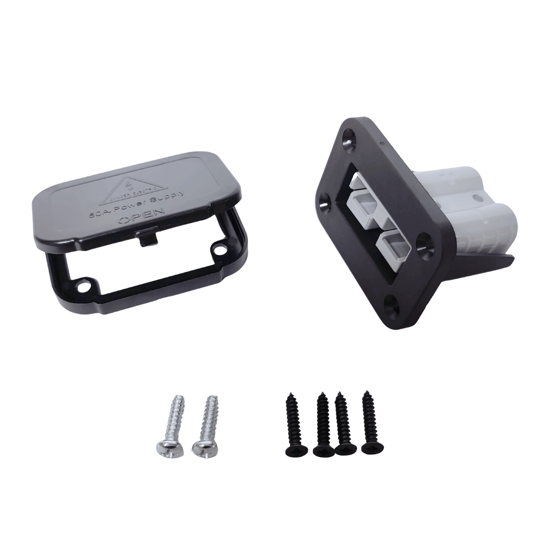 Montagerahmen aus schwarzem Kunststoff mit Abdeckkappe für den Einbau von Anderson-kompatiblen SB50-Steckverbindern, einschließlich Befestigungselementen und Steckverbinder.